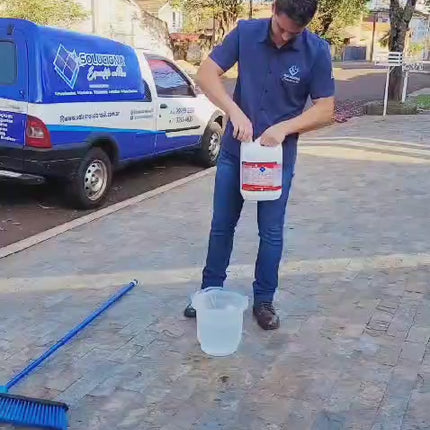 Utilizando um balde de plástico, faça a diluição do produto e aplique uma fina camada sobre o piso, deixe agir por 5 a 10 minutos, proceda a esfregação com fibra adequada ao tipo de revestimento com suporte manual, lavadora do tipo enceradeira ou polidora, escove os rejuntes com uma escova, enxágue com água em abundância até remover totalmente o resíduo do produto.